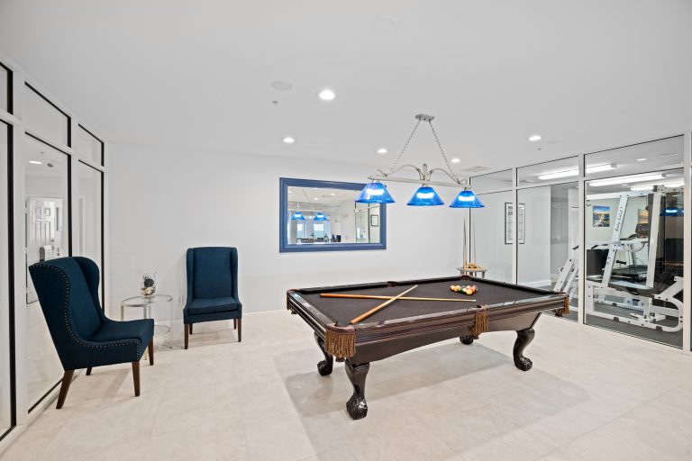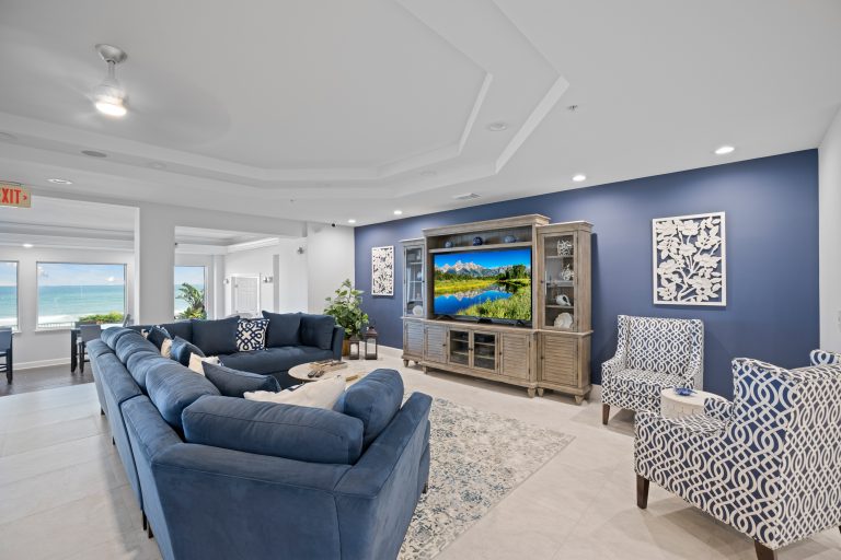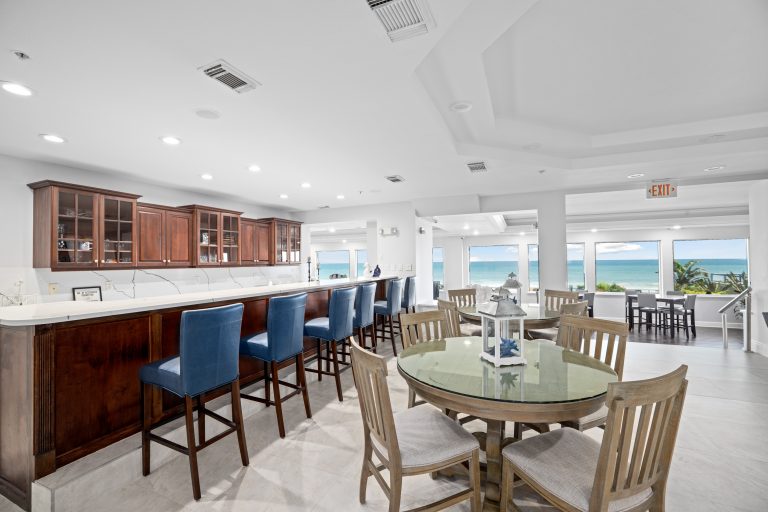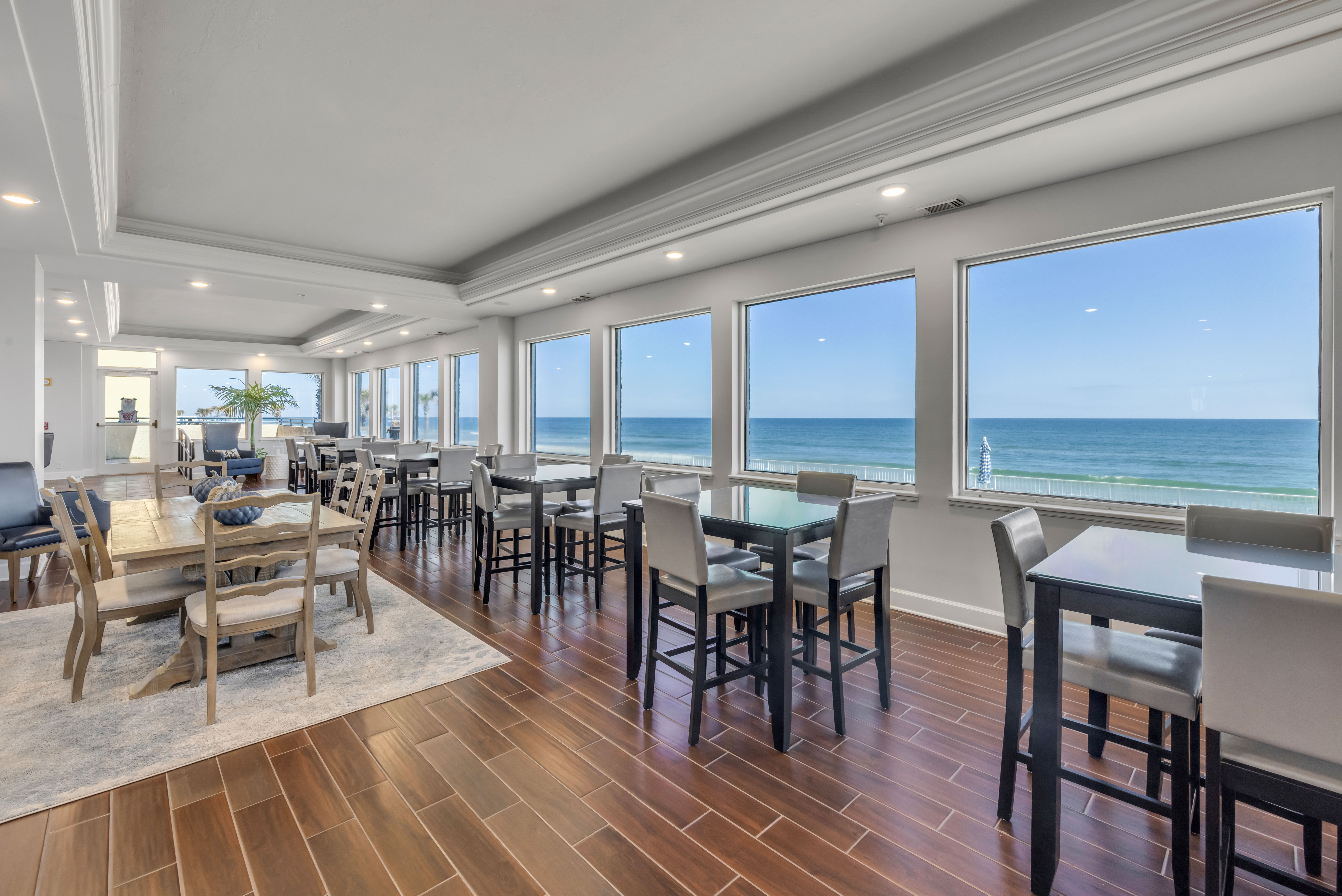 The elegant club room at Towers Ten provides residents with a sophisticated gathering space featuring floor-to-ceiling windows that showcase spectacular ocean views. With comfortable seating areas, rich hardwood floors, and an open layout perfect for socializing or quiet relaxation, this exclusive amenity offers a refined retreat where residents can entertain guests or simply enjoy the endless blue horizons from the comfort of an upscale, resort-style setting.